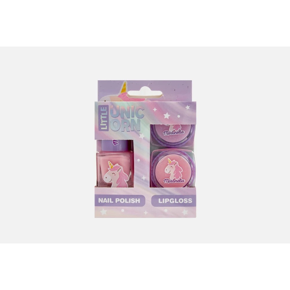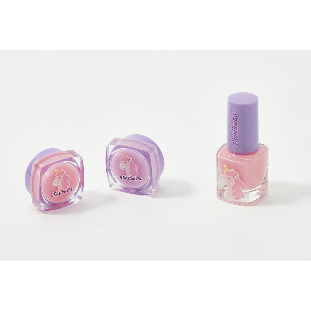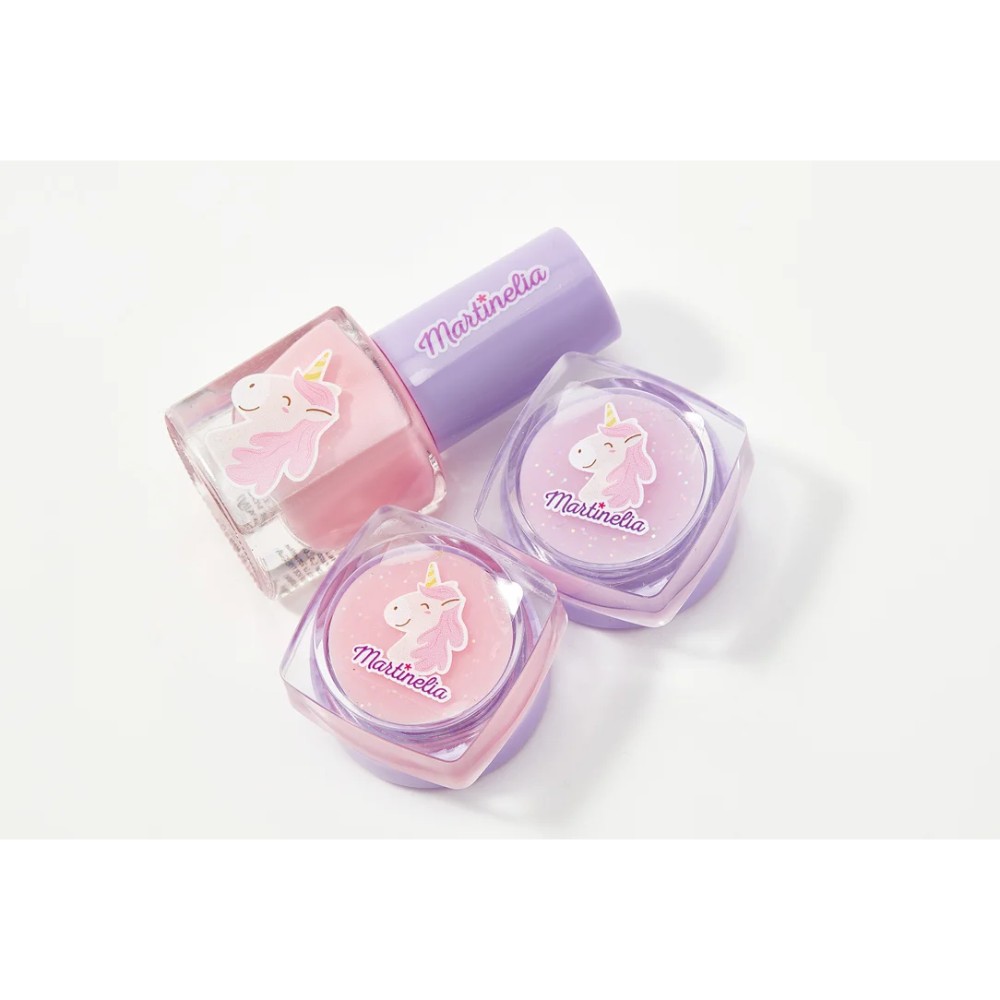 Happy little fairies with the Martinelia Little Unicorn Mini Trio set – a cosmetic set for ladies that includes 1 water-soluble pink nail polish and 2 lip glosses.