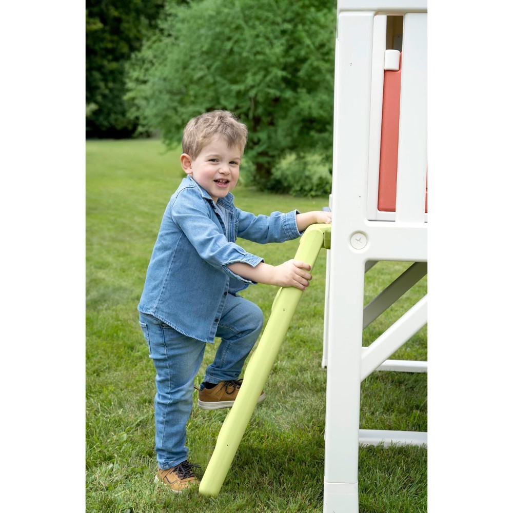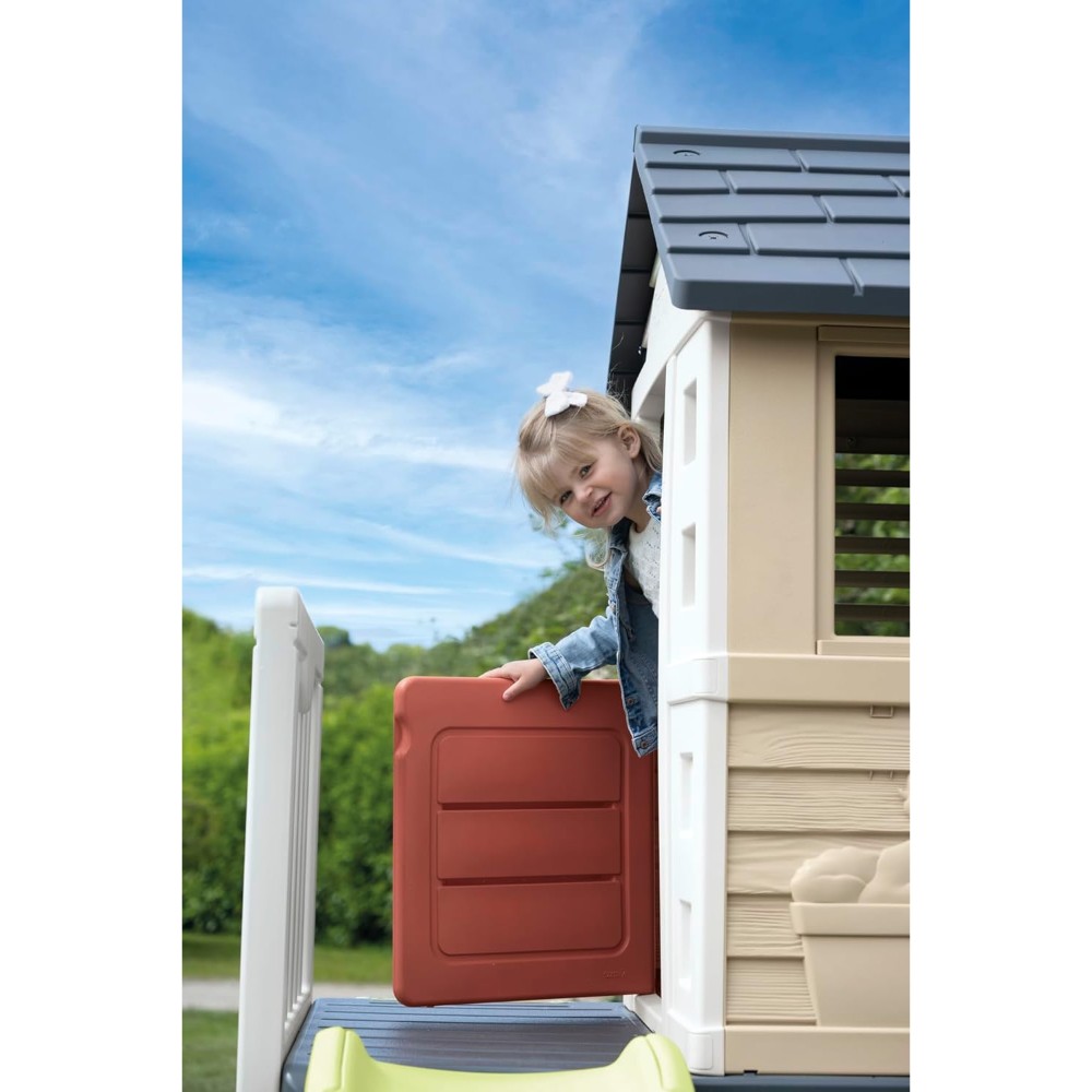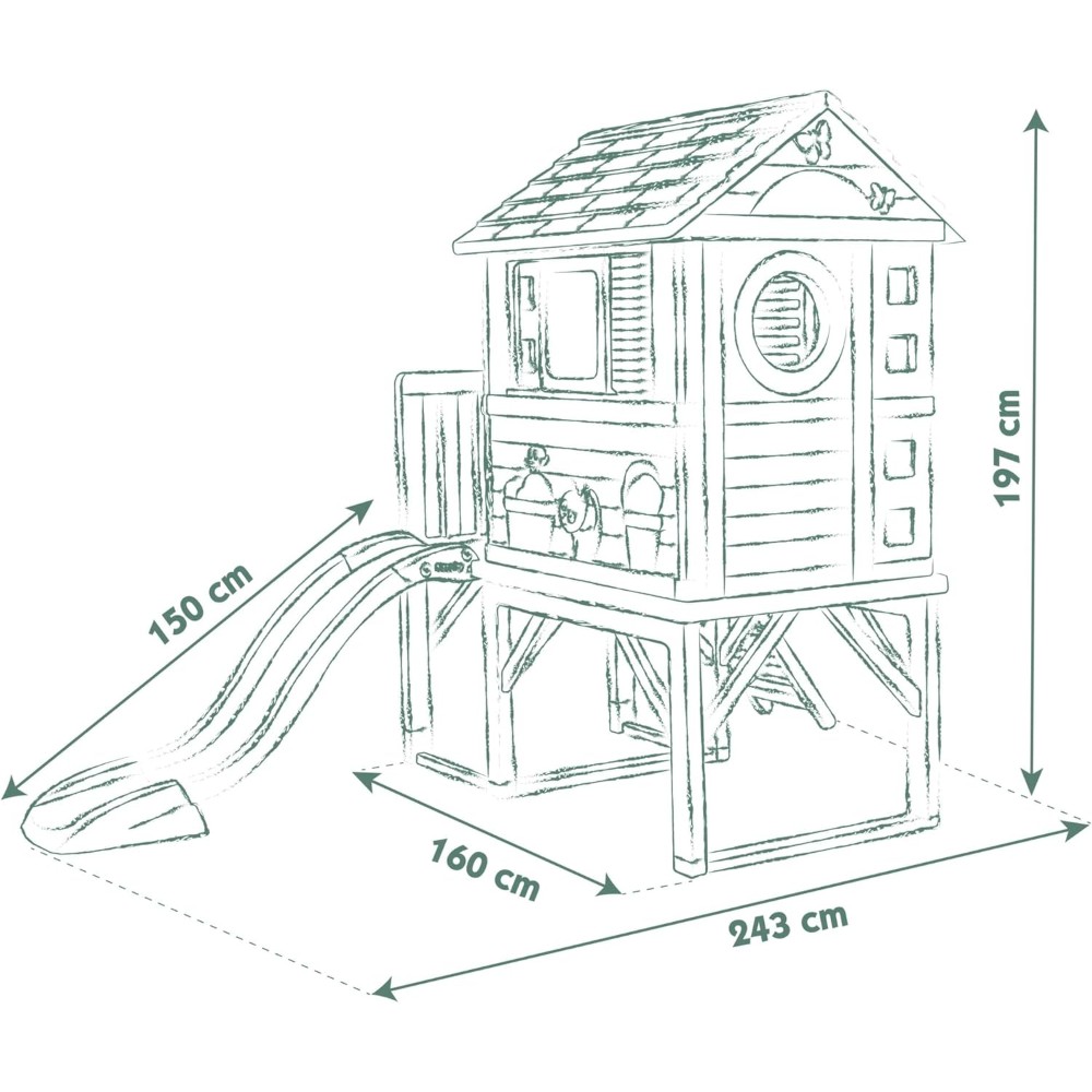 The Playhouse on Stilts is perfect to have fun with friends and develop imagination! Like real adventurers, your children will be able to reach their hut thanks to the ladder. Set on a 70cm high platform, the playhouse gives an unobstructed view of the garden. Thanks to the half door and the 3 windows on the different facades, your little adventurers will have an eye on everything! While one of your children will have fun with the slide, the other will be able to imagine thousand stories on the house’s porch! Your little ones will be able to play hide and seek thanks to the 2 sliding shutters which will enable them to win the game! This hut will quickly become their favourite place to have fun all day long! In addition to being made with solid materials, the playhouse is anti-UV treated to guarantee its sturdiness and its colours’ durability over time! This toy contains recycled material. Assembled dimensions: W243 x D160 x H197 cm