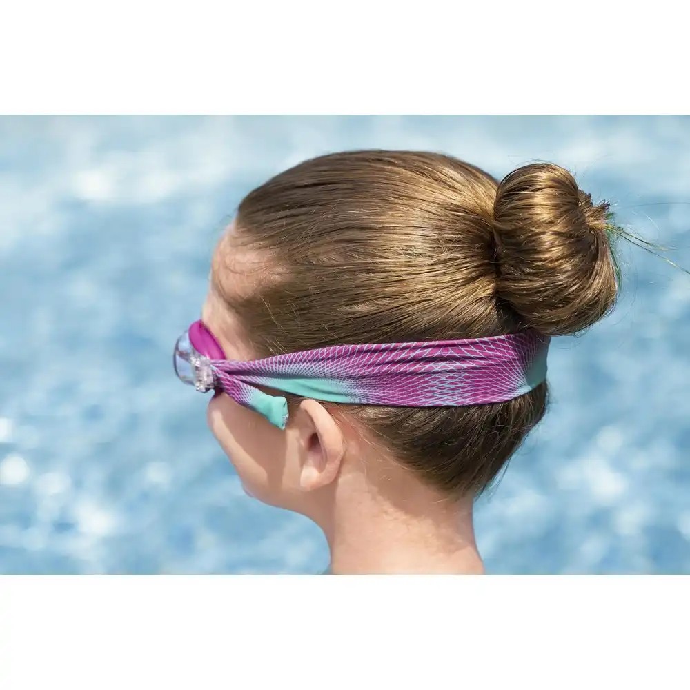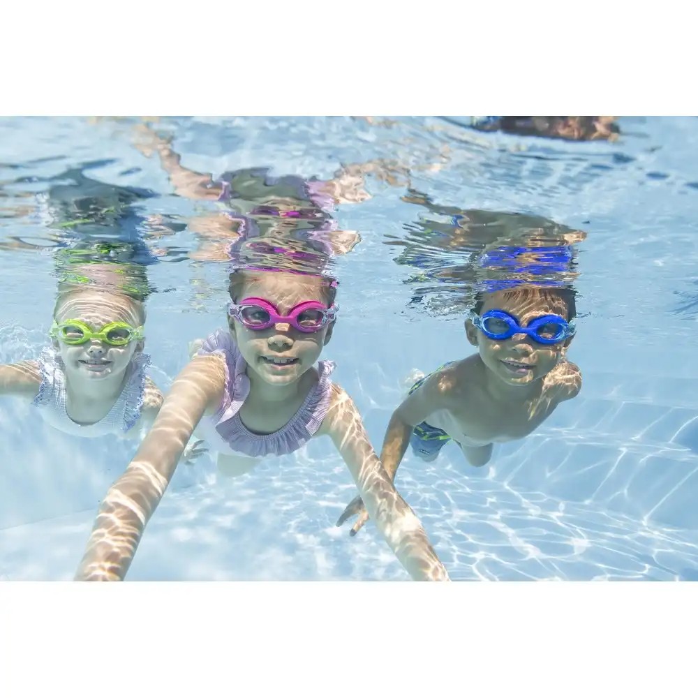 The Bestway® Splashflex™ swimming goggles are the ideal companion for little water lovers aged 7 and up. Whether in the pool, lake, or sea – these goggles ensure that children can make the most of their time in the water. The soft, comfortable silicone eye cups fit the face perfectly and prevent water from entering. The impact-resistant polycarbonate lenses are not only extremely durable but also offer effective UV protection, shielding the eyes from harmful sun rays. The adjustable Lycra headband can be individually fitted, ensuring a pain-free and comfortable fit – ideal for long days in the water. The Splashflex™ swimming goggles are 100% latex- and PVC-free, making them especially skin-friendly and safe for children. Thanks to the adjustable Lycra headband, the fit of the goggles can be easily adjusted. Parents can rest assured that the goggles fit securely and comfortably without exerting any unpleasant pressure. The polycarbonate lenses not only offer clear underwater vision but also effective protection against UV rays. This allows children to swim outdoors without worry while protecting their eyes. When ordering from our website, please specify which color you wish to have in the NOTE section. If item is not specified, it will be sent randomly.