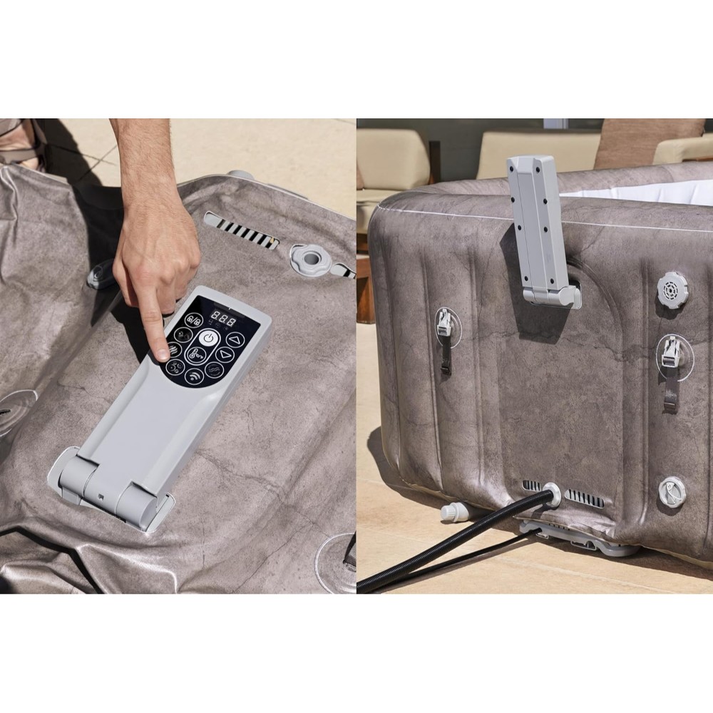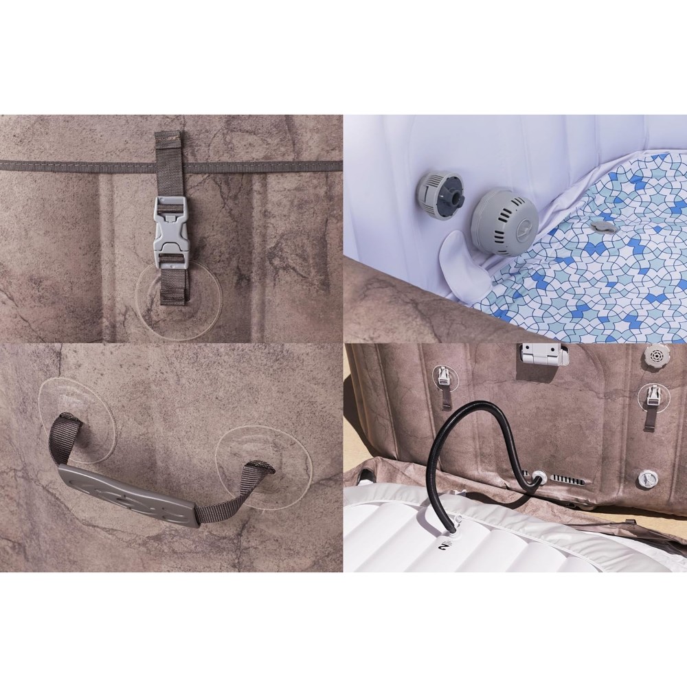 Experience ultimate relaxation and transform your garden or patio into a luxurious wellness oasis with the Bestway® LAY-Z-SPA® Energy-saving whirlpool Rome AirJet™. Measuring 180 x 180 x 71 cm, this hot tub offers enough space for up to 6 people and ensures unforgettable moments of well-being. Made from robust 3-layer TriTech® material and equipped with the MaxHold™ inner support construction, this hot tub not only guarantees exceptional stability, but also a long service life. Thanks to the integrated EnergySense® energy-saving insulation, the hot tub is up to 40 % more energy-efficient, making it particularly cost-saving. With a water capacity of 840 litres and a filled weight of 871 kg, the Rome AirJet™ offers an ideal bathing experience. The hot tub impresses with its elegant marble look in brown, which gives your outdoor area a stylish and modern touch. The polygon-look floor rounds off the luxurious graphic and creates a particularly appealing atmosphere. The high-performance heater can heat the water up to 40 °C and ensures cosy warmth in any weather. The frost monitor technology protects the whirlpool from damage caused by low temperatures and enables automatic heating from a water temperature of 6 °C. Enjoy the soothing bubble massage with warm air from 140 AirJet™ jets for perfect relaxation. A reliable cartridge filter system with a system flow rate of 1,325 l/h keeps the water clean and fresh at all times. The flip-up control panel can be conveniently controlled via an app, allowing you to set all of the spa’s functions from your smartphone. The power saving timer allows you to plan heating up to 40 days in advance and the automatic switch-off function increases safety. The integrated Ultrafit- spa heater ensures maximum efficiency and comfort. Safety comes first: the hot tub is GS-certified by TÜV Rheinland and has a monitoring system for the earthing cable and a PRCD. The button lock and childproof clip fasteners offer additional safety and ensure a carefree bathing experience. The hot tub can be assembled and disassembled quickly and easily without tools. Thanks to the practical carrying handles and air filling with the spa heater, assembly is child’s play. An integrated drain pipe with garden hose adapter makes it easy to empty the pool. The scope of delivery includes a 2-part insulating thermal cover, a ChemConnect® chemical dispenser , a filter cartridge (size VI) and two . VI) and two repair patch.