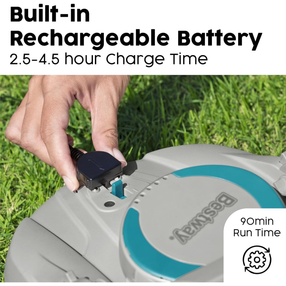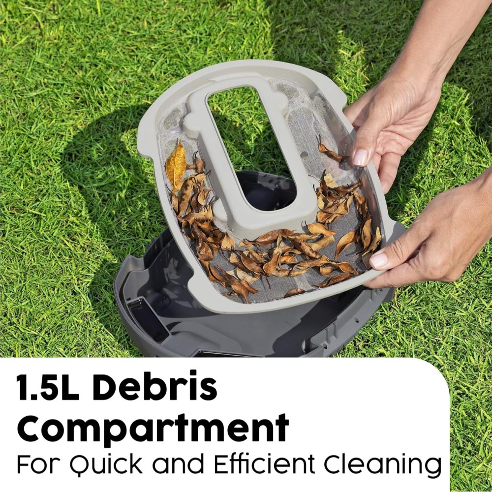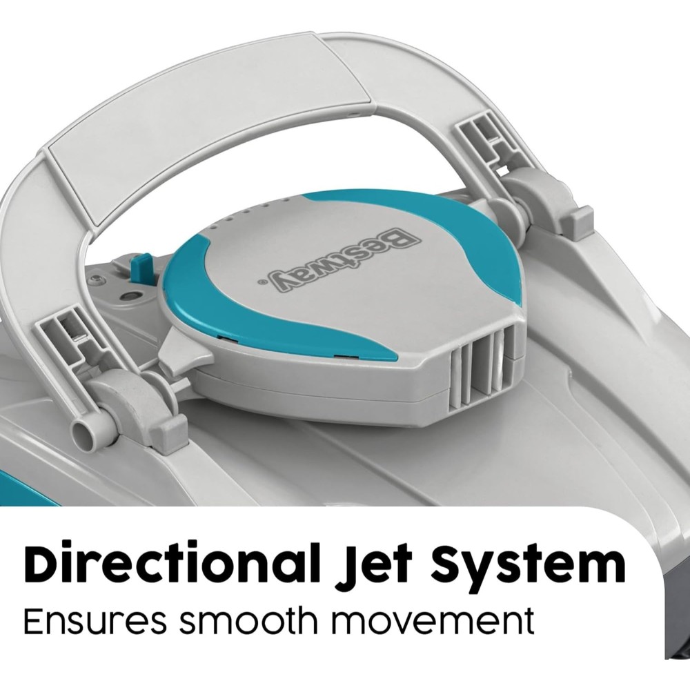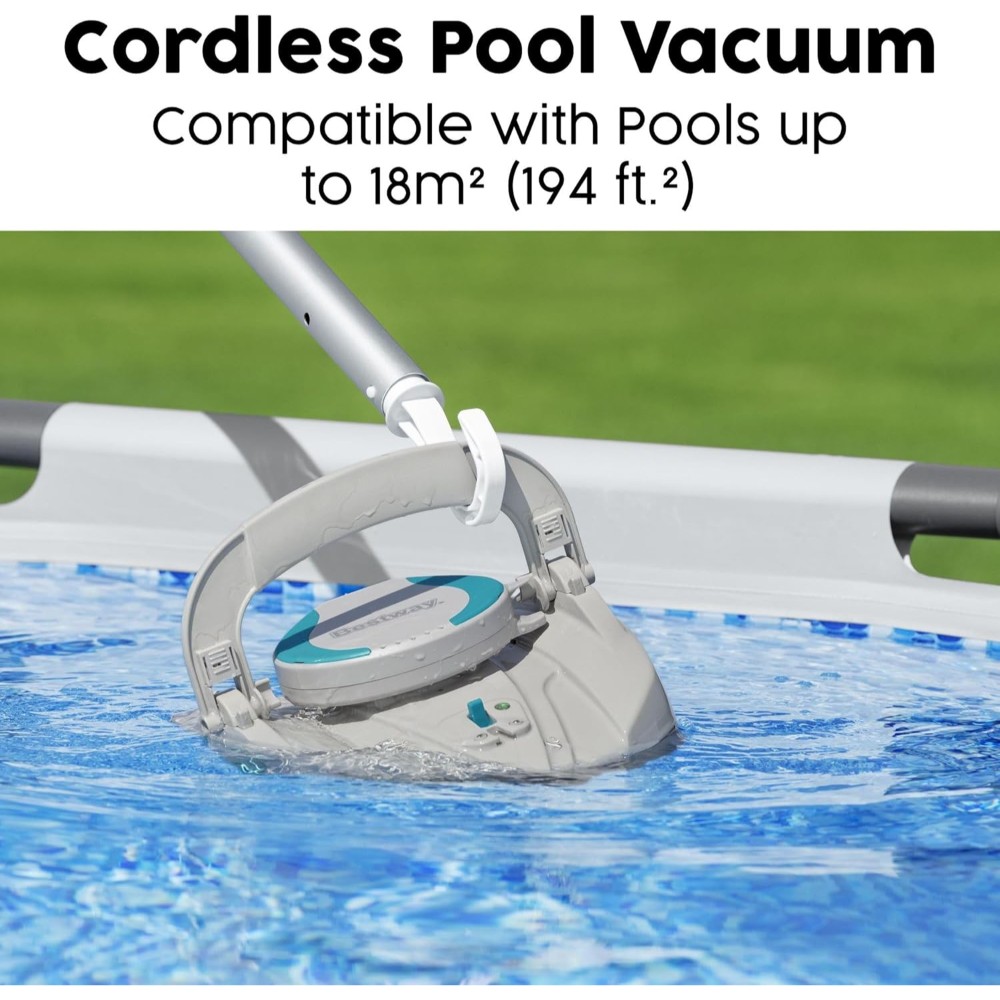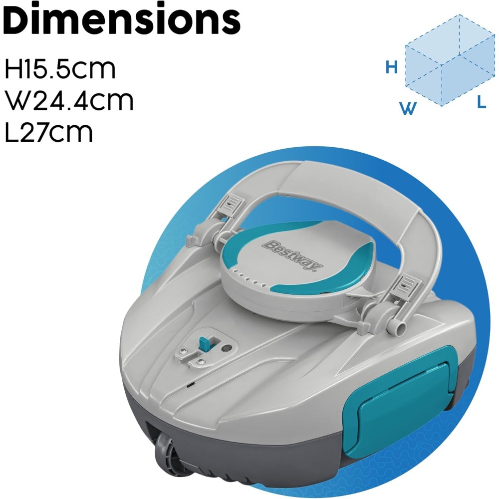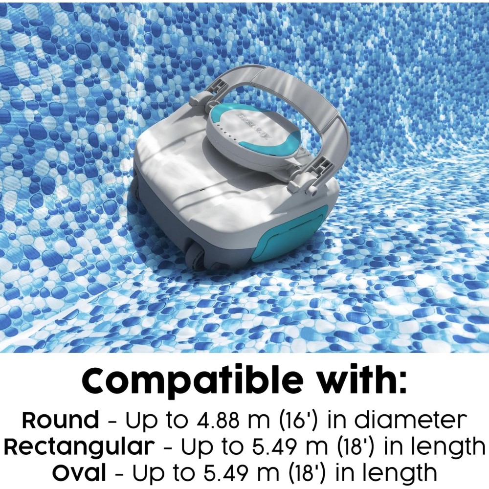 The Bestway® AquaTronix™ G100 Robotic Pool Vacuum is an autonomous pool cleaning robot that will do the dirty work to keep your pool clean and pristine. The self-propelling design provides an easy way to keep your pool water clean all season long, as the vacuum moves across the bottom of the pool on its own. How it Works: The device is controlled with a single power switch and includes built-in sensors that prompt the AquaTronix to begin cleaning when submerged in water and power off when outside of the water, protecting the motor and improving the lifespan. The large, built-in debris compartment holds up to 1.5 L (0.4 gal.) of debris before it needs to be emptied. Designed with a rechargeable battery, the AquaTronix will operate for a 30 minutes when fully charged, providing optimal time to get your pool crystal clear. Features: This cordless robot has a full range of motion with a directional jet system that allows it to change direction when it encounters walls or obstacles. Plus, the quick-click buckles make maintenance and cleaning a breeze – just pop open the compartment and remove debris from the compartment. The robot is easy to use, with a top handle and an included retrieval kit that make it simple to get it back out of the water. Pool Compatibility: The AquaTronix is compatible with flat-bottom above ground pools up to 18 m² (194 ft.² ) in total area, working best with round pools up to 4.88 m (16 ft.) in diameter, rectangular pools up to 5.49 m (18 ft.) in length, or oval pool up to 5.49 m (18 ft.) in length. Summer cleaning has never been easier than with the Bestway AquaTronix G100 Robotic Pool Vacuum.