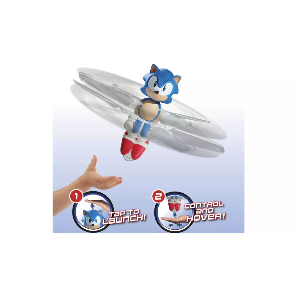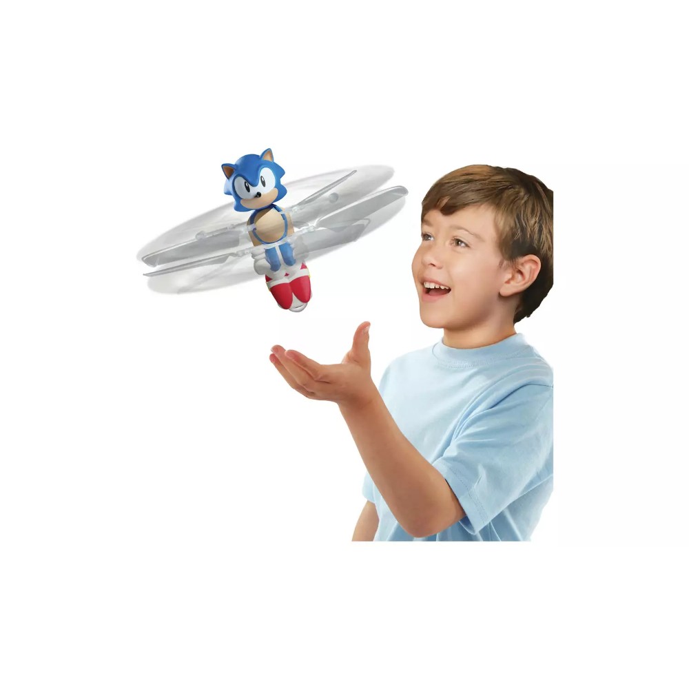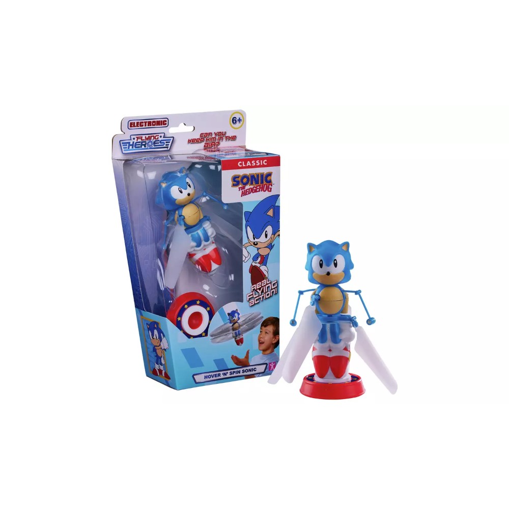 Take Flying Heroes to the next level with the Hover ´n Spin Sonic! With real flying action, Sonic takes to the air with motorised propellers. Once he´s flying, simply place your hand beneath Sonic to guide him back up in the air. Hover ´n´ Spin Sonic also comes with a USB charging cable and standing base.