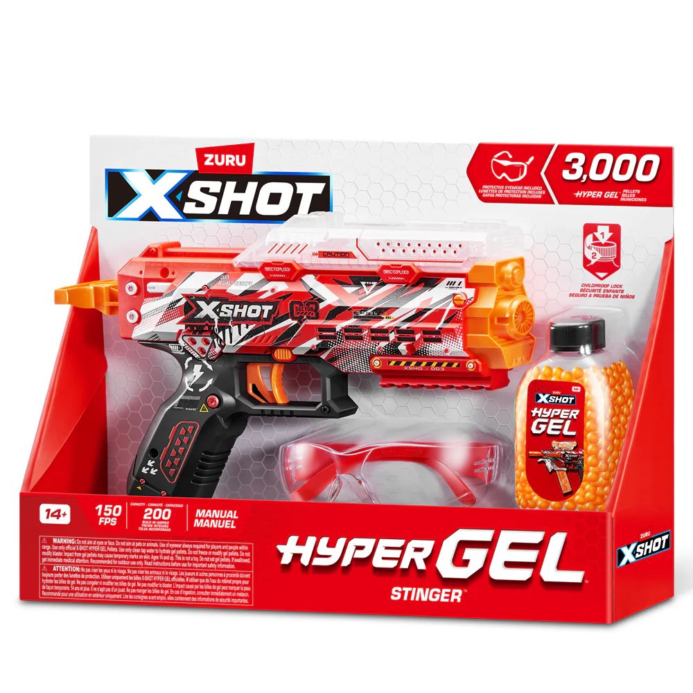 It’s time to get hyped up with the XSHOT Hyper Gel Stinger! The XSHOT Hyper Gel Stinger uses a manual pull-to-primary mechanism to blast Hyper Gel pellets at up to 10 feet per second. The Stinger has a 250 pellet capacity. Supplied with 3,000 Hyper Gel pellets and protective eyewear, just add water and start the ultimate gel blaster battle!