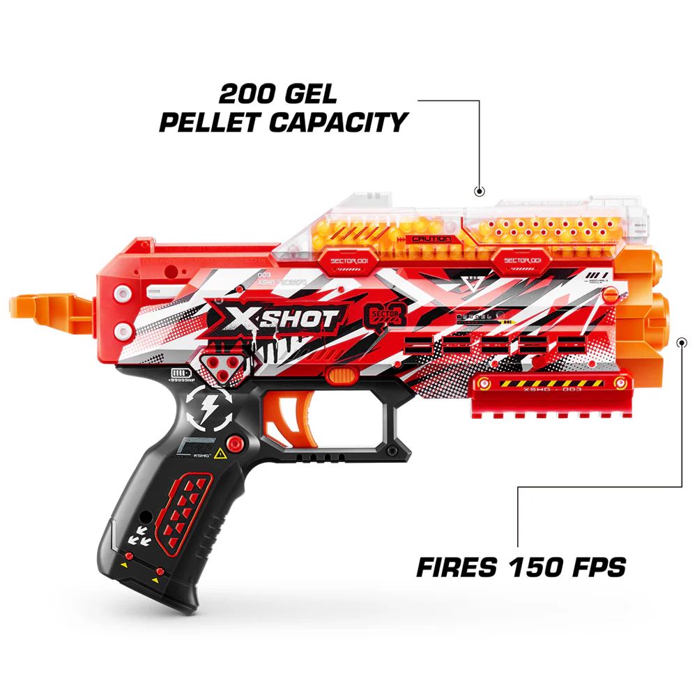 Hype: The XSHOT Hyper Gel Stinger explodes Hyper Gel particles at 100 feet per second.
