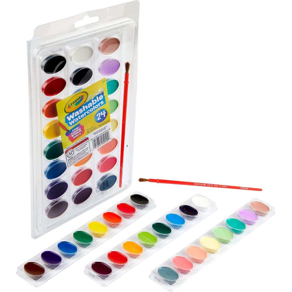 A paint palette – in 24 different colours.1 brush included. Crayola Washable paints for children can be removed from children’s skin and most washable clothing.For ages 3 and above.