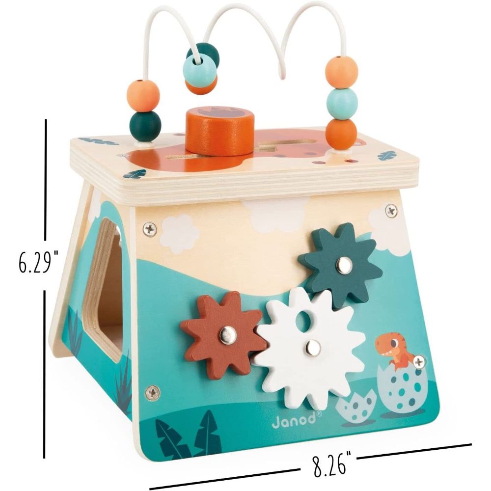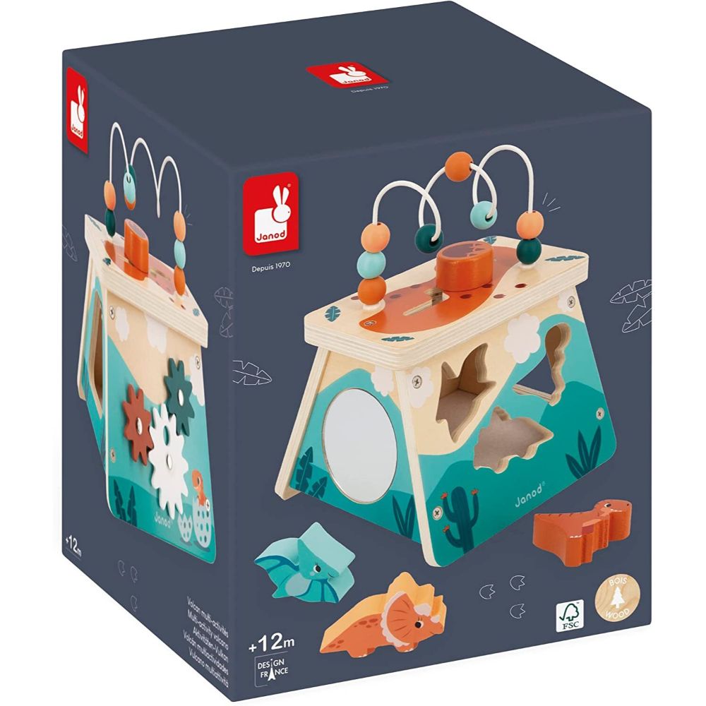 What a pretty dinosaur-themed shape-sorting box! You’re bound to love the colours and details found on this easily transportable play cube. This multi-activity volcano boasts multiple games that will appeal to children aged 12 months and up. The front features a shape sorter with wooden dinosaurs to slot through the correct holes. Toddlers will need to scratch their brains to figure out where to place the cute Tyrannosaurus, Triceratops and Pteranodon! The dinosaurs won’t make any noise when they drop, thanks to the felt at the bottom of the box. Then plunge your hand into the side to retrieve all the wooden pieces. The back boasts 3 gears that will introduce little ones to the world of rotation and speed, whilst also developing their dexterity. On the left side, baby will have fun starring at their reflection in a mirror, while there are 2 other games on the top of the volcano: a maze and an abacus with 8 wooden beads. This beautiful early-learning toy is made from FSC® wood.