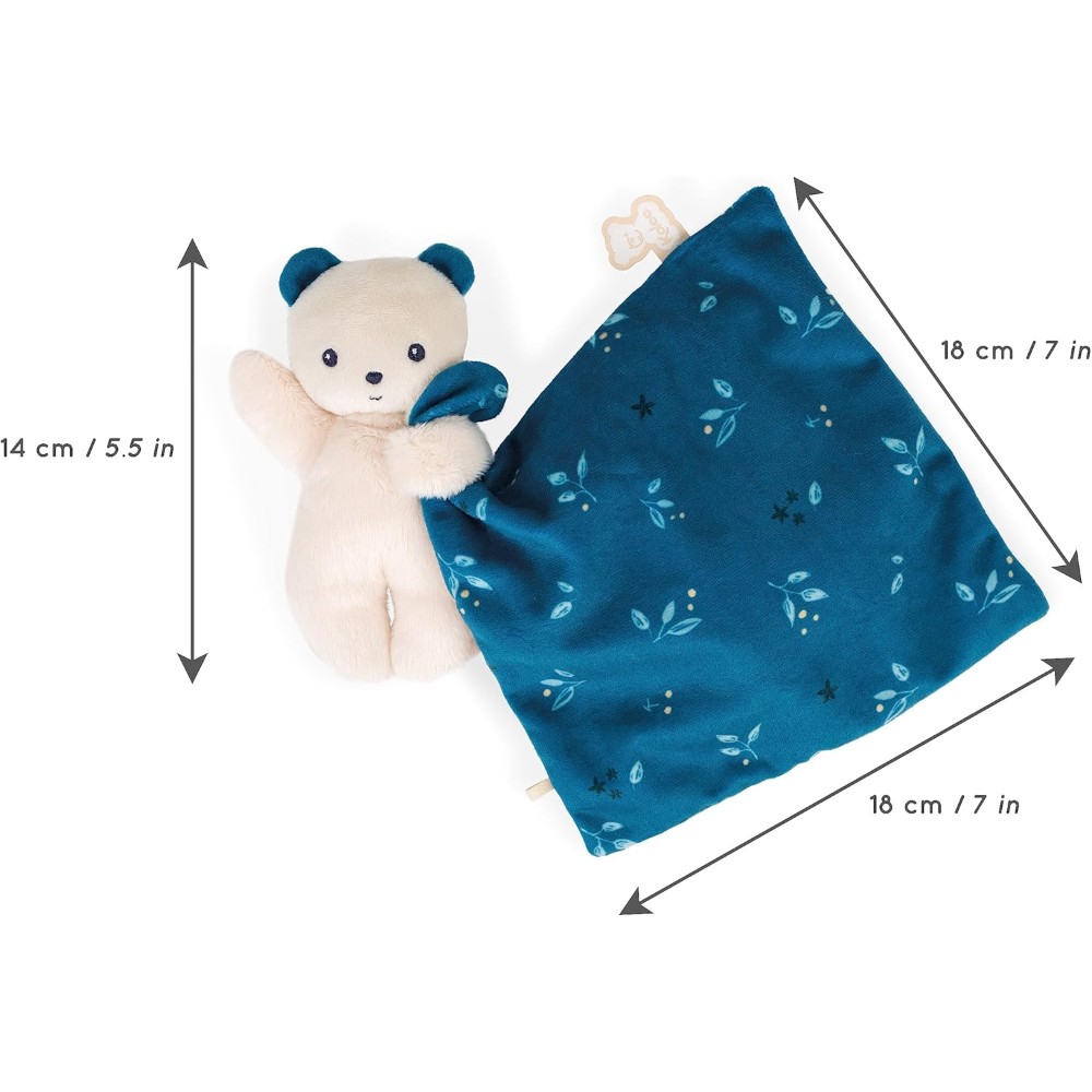 This bear nestled in a square of softness will be the best companion for cuddling baby. Made of recycled materials and stuffing from plastic bottles, this comforter is 100% eco-friendly. With its soft little micro-velvet body, the bear is easy to grasp and hold in baby’s hand. The square blanket he holds between his hands is in a midnight blue print with nature-inspired motifs. This gentle print is found in the bear’s ears and enhances the whole. Presented in a beautiful box that can be reused as a storage case. It is the perfect comforter for offering a 100% ‘eco-lovely’ gift.
