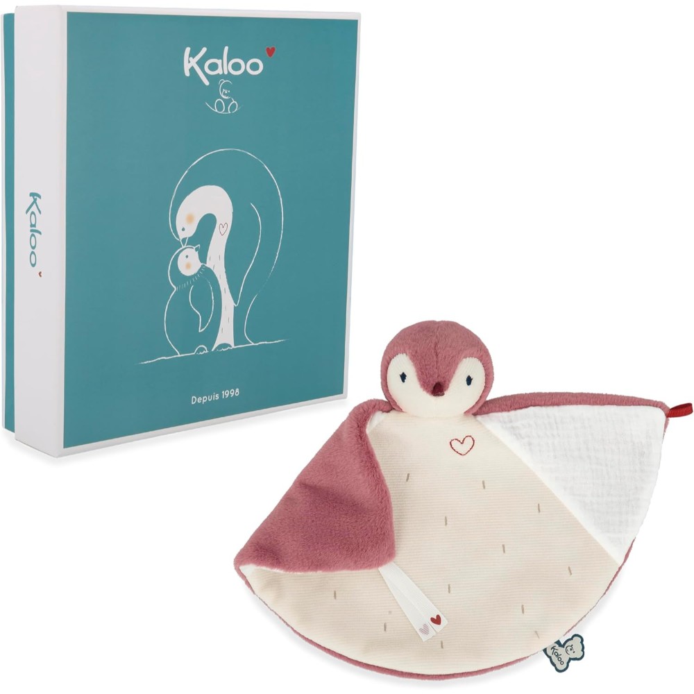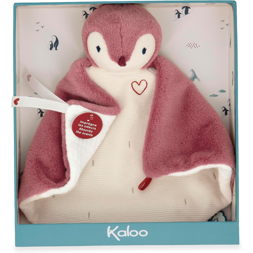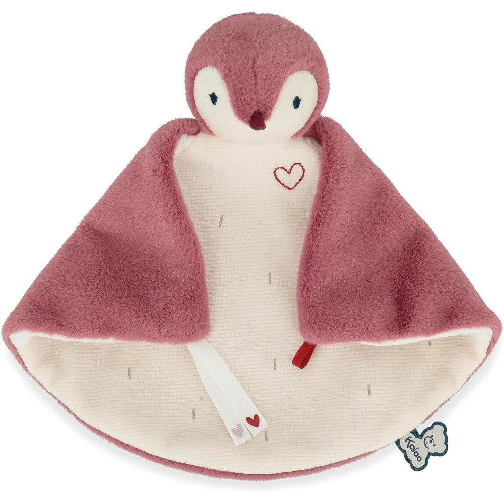 A pink comforter in which tenderness and attachment go hand in hand! This penguin comforter – which is suitable from birth upwards – has it all: different materials to be felt time and time again, refined embroidered detail and ribbons, an adorable face and a distinctive feature that will reinforce a child’s unique bond with their parents. In fact, this flat comforter is made of corduroy, synthetic fur (polyester) and cotton muslin fabric. The latter material easily absorbs scents and therefore allows parents to keep the penguin comforter close at hand before giving it back to baby with reassurance in mind. This is a great tool for little ones suffering from separation anxiety, whether at bedtime or before a busy day at nursery, etc. Besides the multiple materials that can be explored at will, this pink comforter also boasts a pretty heart: a symbol of all the affection you hold dear for baby. Protection and bonding go hand in hand, thanks to the heart-decorated ribbon which allows the penguin’s flippers to be tied together. It is also really handy for hanging a dummy! This round yet flat comforter measures 24 cm in height and is machine-washable. The head padding is made of recycled polyester. The product comes in a lovely matching box, making it the perfect baby shower or newborn gift! The box is personalisable and can be reused to store your little ones’ first keepsakes. This Kaloo comforter is sure to become baby’s safe yet soothing best friend, thanks to its various materials, intense softness and the option to reassure baby with familiar smells. It is part of our Complice range: a collection of soft toys and comforters that express love and comfort, to illustrate the bond shared between baby and their parents, and help them deal with these very first separations.
