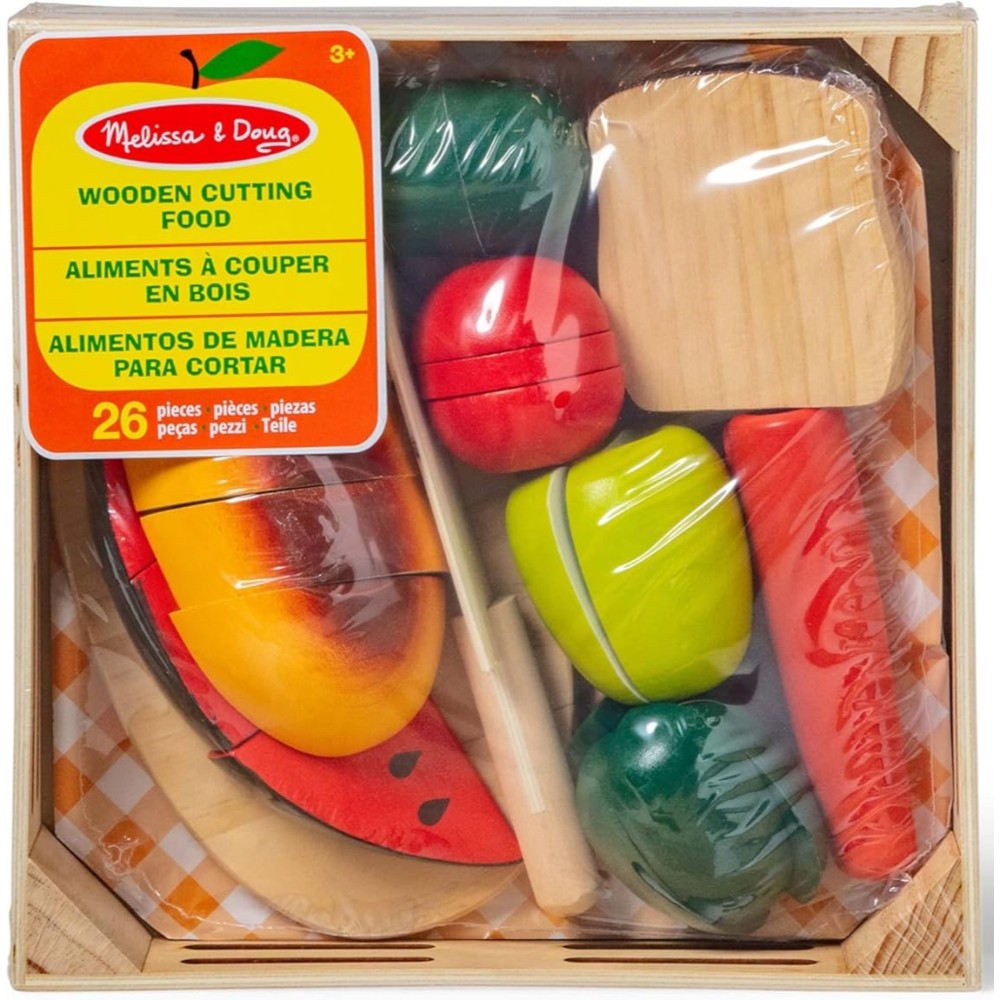 This wooden play food set is perfect for young chefs looking to explore a little mealtime fun–without the mess! It includes eight pieces of wooden food that can be sliced into 27 sections, a cutting board, and a wooden knife. Cutting the food makes a satisfying ‘crunch’–and provides a playful introduction to concepts of ‘whole’, ‘part’, and fractions.
