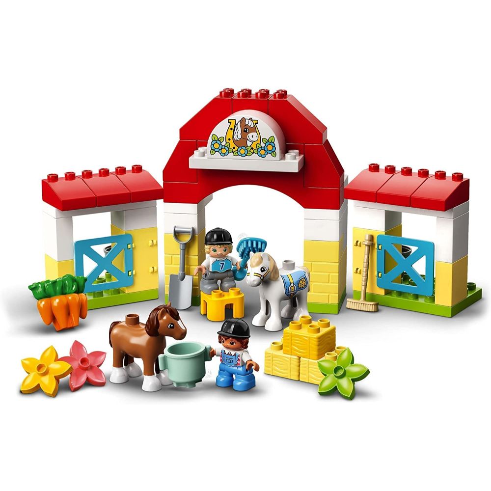 LEGO® DUPLO® Town Horse Stable and Pony Care (10951) has everything a little animal lover needs to care for 2 adorable ponies. The imaginative fun and playful learning will never end.Play-and-learn pony stableIt’s always a fun-packed play-day at the pony stable. The 2 cute ponies need feeding before being taken out for a ride. Then they’ll want to have a drink and be brushed. Don’t forget to prepare a cozy place for them to sleep. As they take care of the ponies in the iconic stable, little animal lovers boost their preschool development, particularly fine motor skills and social and emotional awareness.Hands-on educational toys for toddlersLEGO DUPLO toys put open-ended fun, self-expression and joyful learning into preschoolers’ hands. With DUPLO playsets, parents and young children can share precious developmental milestones as they play together.