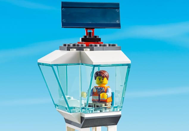 Includes a large model airplane with seating for the pilot and passenger minifigures – including Poppy Starr from the LEGO City Adventures TV series – plus a terminal building with luggage conveyor and a control tower