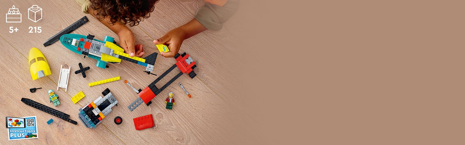 This 215-piece set has all kids need to build a transporter truck and rescue helicopter, with driver and pilot minifigures.
