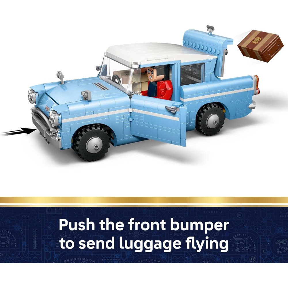 Put the magic of the Weasleys’ Enchanted Flying Ford Anglia™ in the hands of young wizards, witches and Muggles™ with this car toy building set (76470) for display and play. A super Harry Potter™ gift for boys, girls and any fans ages 10 years oldand up, it is the most detailed LEGO® brick model to date of the iconic vehicle. Place brick-built Ron Weasley™ and Harry Potter figures in the car with Harry’s pet Hedwig™ to bring Harry Potter and the Chamber of Secrets™ scenes to life. Activate magi cal functions to make the trunk and doors open and send our heroes’ luggage flying out of the trunk, just like in the movie. Kids can build with confidence using the LEGO Builder app, which lets them zoom, rotate in 3D and track progress with easy-to-follow digital instructions. Set contains 868 pieces. DIMENSIONS – The toy vehicle in this 868-piece set measures over 3.5 in. (9 cm) high, 9.5 in. (25 cm) long and 4 in. (10 cm) wide.