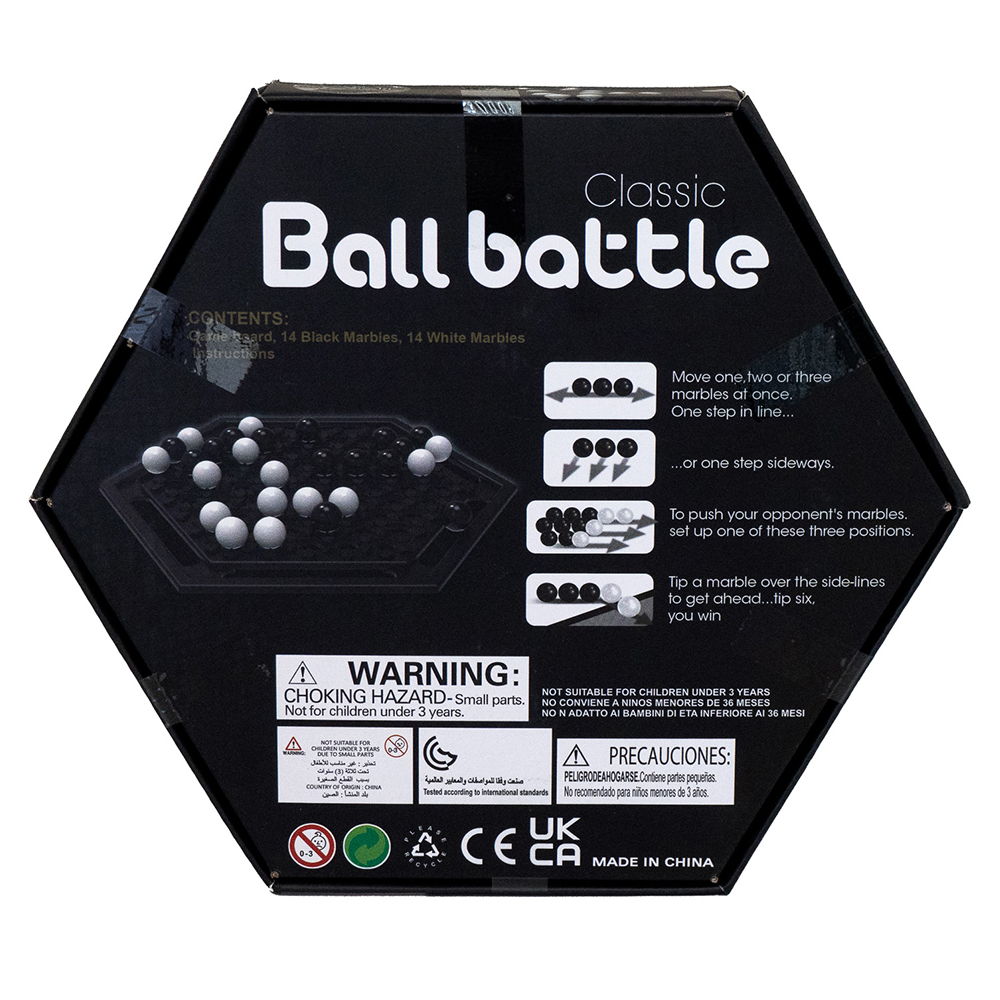 Move one, two or three marbles at once. One step in line or one step sideways, to push your opponent’s marbles out. Tip a marble over the side-lines to get ahead…tip six, you win. Contains: game board, 14 black marbles, 14 white marbles and instructions.