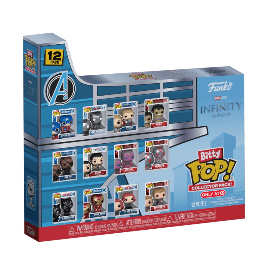 Your favorite Marvel Studios Pops! have been shrunk into Bitty POP! collectibles! Expand your lineup with this Collector Pack of Bitty POP! collectibles featuring your most beloved super heroes! This exclusive 12-pack includes Bitty POP! Captain America, Bitty POP! War Machine, Bitty POP! Thor, Bitty POP! Hulk, Bitty POP! Nick Fury, Bitty POP! Loki, Bitty POP! Vision, Bitty POP! Ultron, Bitty POP! Black Panther, Bitty POP! Iron Man, Bitty POP! Black Widow, and Bitty POP! Hawkeye. Bitty POP! collectibles are packaged in hard acrylic cases with detachable bottom lids. Detachable bottom lids double as acrylic bases, to which the Bitty POP! collectibles are adhered. Vinyl collectibles are approximately 0.9 in (2.3 cm) tall.