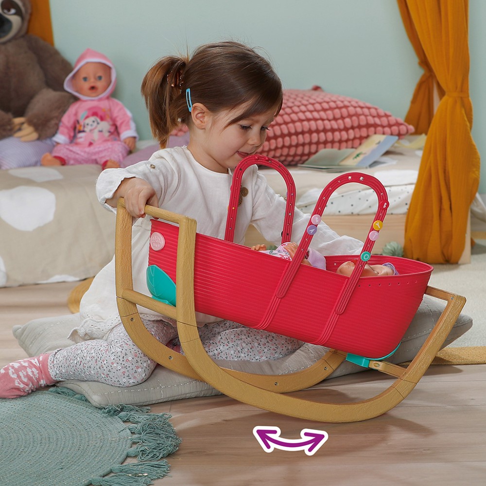 Transform playtime into a nurturing experience with the versatile BABY born 3-in-1 Bassinet. This delightful accessory is perfect for little caregivers who love to pamper their dolls, offering a multifunctional design that seamlessly transitions between a carrycot, cradle, and cot. With just a few simple adjustments, your child can explore different ways to care for their beloved dolls like Emma, Teddy, and more. Versatile Design: The bassinet’s ingenious design allows it to be easily converted from a cradle to a cot by flipping the cradle frame over. This wooden-look frame serves as a sturdy bed base for the vibrant red basket, which can be placed on top to create a cozy sleeping space. The gentle rocking motion of the cradle is perfect for soothing dolls to sleep, adding an element of realism to your child’s play. Portable Comfort: Equipped with convenient handles, the basket can be effortlessly transported, ensuring that your child’s little friends can enjoy a comfortable nap wherever they go. Whether it’s a playdate or a family outing, the BABY born Bassinet ensures that dolls are always snug and secure. Cozy Bedding: The set includes a soft melon pillow, a delicate sheet, and a fluffy blanket adorned with charming fruity motifs. These accessories create a warm and inviting environment, encouraging sweet dreams and imaginative adventures. Personalized Touch: The bassinet comes with colorful pins that can be attached to the edge and handles of the basket. This feature allows your child to express their creativity by redesigning the cot to reflect their personal style. It’s a wonderful way to make playtime even more engaging and unique.
