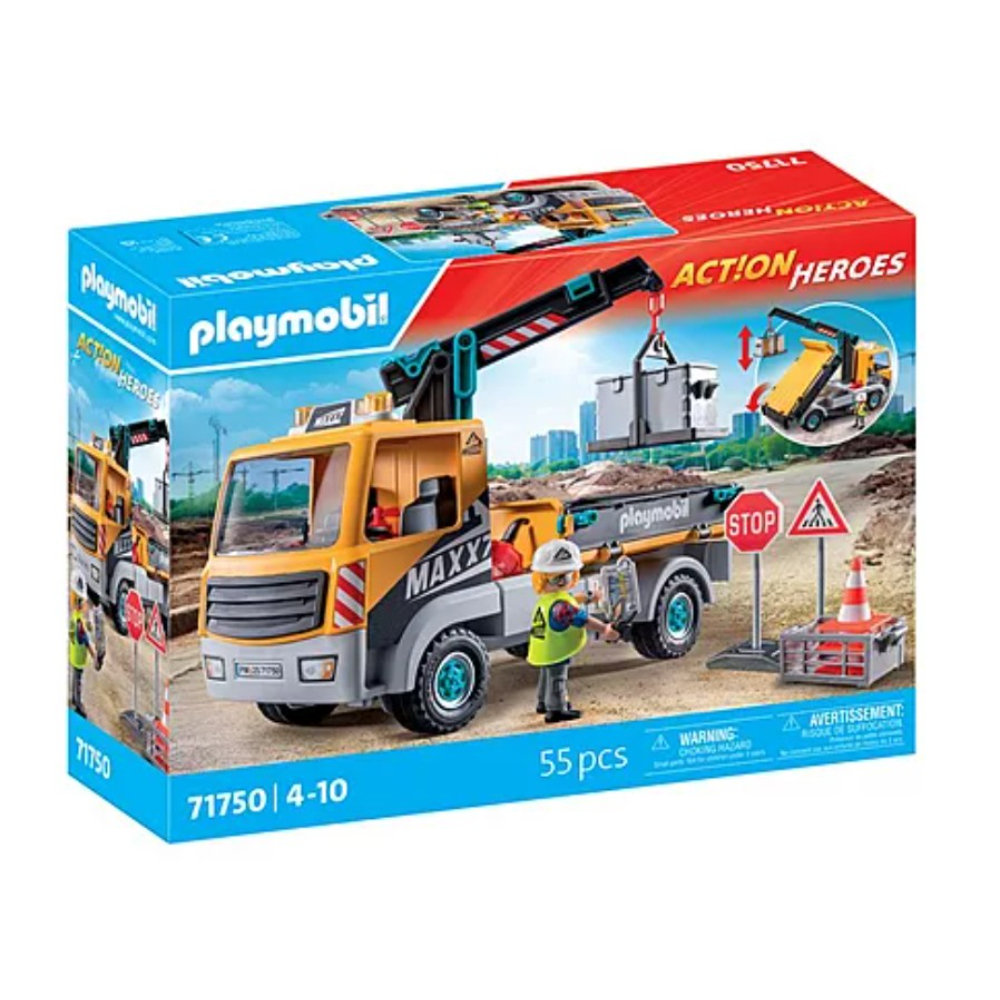 Fortunately, the construction workers have their big yellow truck with them! With its telescopic arm that can be extended and swiveled, it can maneuver all the heavy objects back and forth on the construction site with ease. Its large loading area can be tilted up and down and the side sections can be folded down.