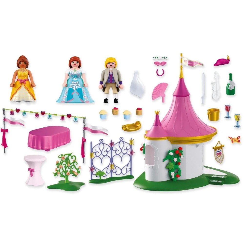 Today is a very special day: Two princess friends are hosting an elegant masquerade ball in the palace garden. The beautifully decorated pavilion, adorned with colorful garlands, ribbons, and fluttering flags, becomes the center of the celebration thanks to a buffet filled with delicious cupcakes and cool drinks. Laughter, whispers, and dancing fill the air. A young courtly guest with a white violin provides the musical highlight – and of course, invites the princesses to dance afterward. For extra graceful dance moves, the wide skirts can be removed. And when the ball comes to an end, the buffet table can be neatly stored inside the pavilion. An unforgettable afternoon – and everyone is already looking forward to the next masquerade ball! Beneath the fluttering flags, the celebration continues with even more magical details to explore. Adjustable silicone masks let the royal guests switch up their mysterious looks, while the trellis transforms the pavilion into charming dance or dining spaces. With sparkling décor, blooming vines, and plenty of elegant accessories, invite imaginative storytelling and creative play. This enchanting PLAYMOBIL playset lets little dreamers create dazzling fairytale scenes again and again – the magical possibilities are endless! Figures: 2 Princesses, 1 Prince Accessories: 2 Skirts, 1 Hair Wreath, 1 Hat, 2 Masquerade Masks, 1 Fan, 1 Handkerchief, 1 Violin with Bow, 1 Garden Pavilion, 1 Large Green Base Plate, 1 Large Fabric Flag, 1 Large White Flag, 9 Dark Green Vines, 3 Light Green Vines, 5 Closed White Rose Blossoms, 5 Half-Open White Rose Blossoms, 5 Open White Rose Blossoms, 5 Half-Open Red Rose Blossoms, 5 Open Red Rose Blossoms, 5 Closed Red Rose Blossoms, 4 Silver Poles, 2 Dark Pink Bows, 2 White Flags, 2 Hot Pink Flags, 1 Garland, 3 Heart-Shaped Decoration Elements, 3 Violet Glass Lamp Decoration Elements, 3 Blue Glass Lamp Decoration Elements, 2 Small Green Base Plates, 1 Plant Vine, 5 Closed Pink Rose Blossoms, 5 Half-Open Pink Rose Blossoms, 5 Open Pink Rose Blossoms, 1 Trellis, 1 Plant, 1 Butterfly, 3 Orange Butterfly Decoration Elements, 3 Pink Star Decoration Elements, 1 Standing Table, 1 Pink Bow, 2 Glasses, 1 Bottle of Sparkling Wine with Towel, 1 Ice Bucket, 1 Side Table, 1 Tray, 4 Cupcakes, 1 Sticker Sheet.