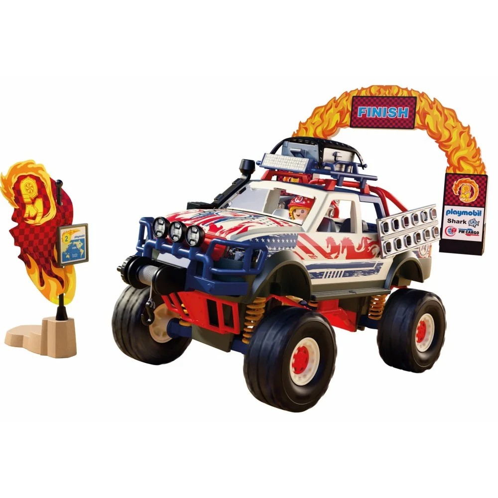 Full throttle through volcanoes, jungles, and rugged mountain passes – nothing can stop the fearless racer! His powerful off-road truck is ready for every stage of the legendary “Ring of Fire” race. A toolbox is safely stored under a flexible net on the roof rack, with additional storage space in the rear of the vehicle. Two sturdy grid plates on the sides can be used as mobile bridges to cross even the deepest ravines. When things get really tricky: the functional winch pulls the driver out of any mess – it can be mounted at the front or rear of the truck! With the included finish line, one thing’s clear: the race is on! Suspension-ready and packed with gear, the PLAYMOBIL Offroad Truck tackles rugged terrain with ease – just drop the tailgate, load up, and charge ahead. The racer tracks every twist of the competition with his info board, while peg plates become instant bridges over wild obstacles. With a mountable winch, roof-rack storage, and room for extra crew, this powerhouse keeps the adventure rolling. A daring PLAYMOBIL set built for champions of the unknown! Suspension-ready and packed with gear, the PLAYMOBIL Offroad Truck tackles rugged terrain with ease – just drop the tailgate, load up, and charge ahead. The racer tracks every twist of the competition with his info board, while peg plates become instant bridges over wild obstacles. With a mountable winch, roof-rack storage, and room for extra crew, this powerhouse keeps the adventure rolling. A daring PLAYMOBIL set built for champions of the unknown! Figures: 1 Racer Animals: 1 Rattlesnake Accessories: 1 Helmet, 1 Pair of Gloves, 1 Winner’s Wreath, 1 Off-road Truck, 1 Front Winch, 1 Roof with Roof Rack, 2 Peg Boards, 1 Toolbox, 1 Gas Canister, 1 Shovel, 1 Wrench, 1 Rope, 1 Oil Bottle, 1 Silicone Net, 1 Start and Finish Arch, 1 Flagpole with Rock, 1 Map, 1 Info Board.